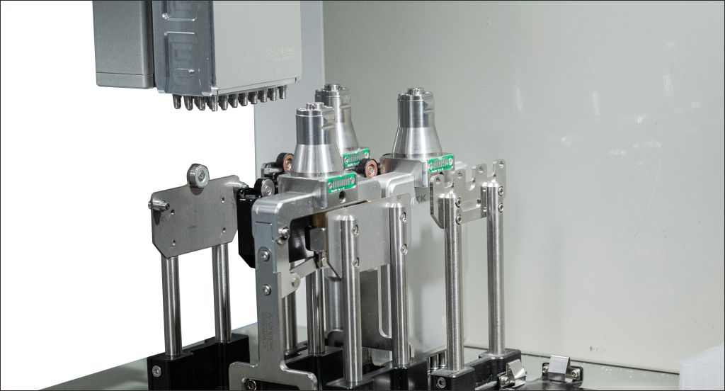 丰富的移液头组库,可自动切换单通道、4通道、独立间距4通道、8通道、12通道、16通道、32通道移液头,移液范围0.5μL~1000μL。