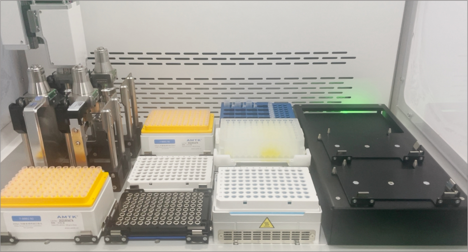 AMTK iLab-100R全自动样品制备系统,主要由三维机械臂、移液模块、防污染模块、控制软件构成,可选配磁力架、加热振荡模块、温控模块、PCR模块、定量模块、真空抽滤模块,兼容横和纵列板位,灵活处理不同的样本数量和不同的应用场景。